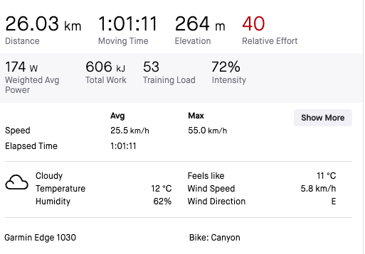 TrainerRoadin harjoituksen nimi on White -5. Kevyttä pyöritystä. Ulkona alkaa olla jo aika viileää; Garminin ajotietokoneen mukaan lämpöasteita oli 12. Oli kuitenkin todella mukava vielä pystyä ajamaan auringonpaisteessa ulkona. Kohta tahkotaan vain sisällä.